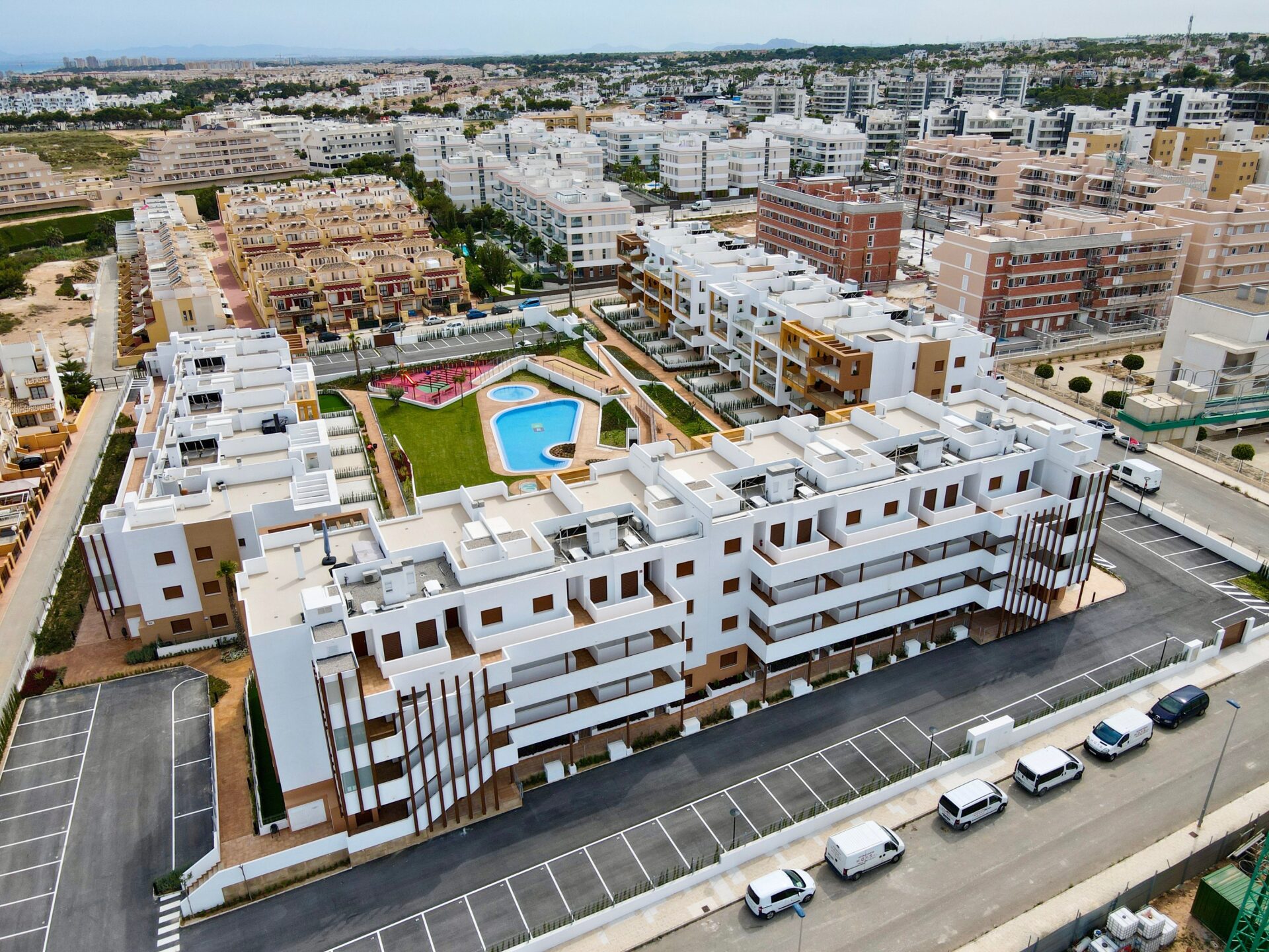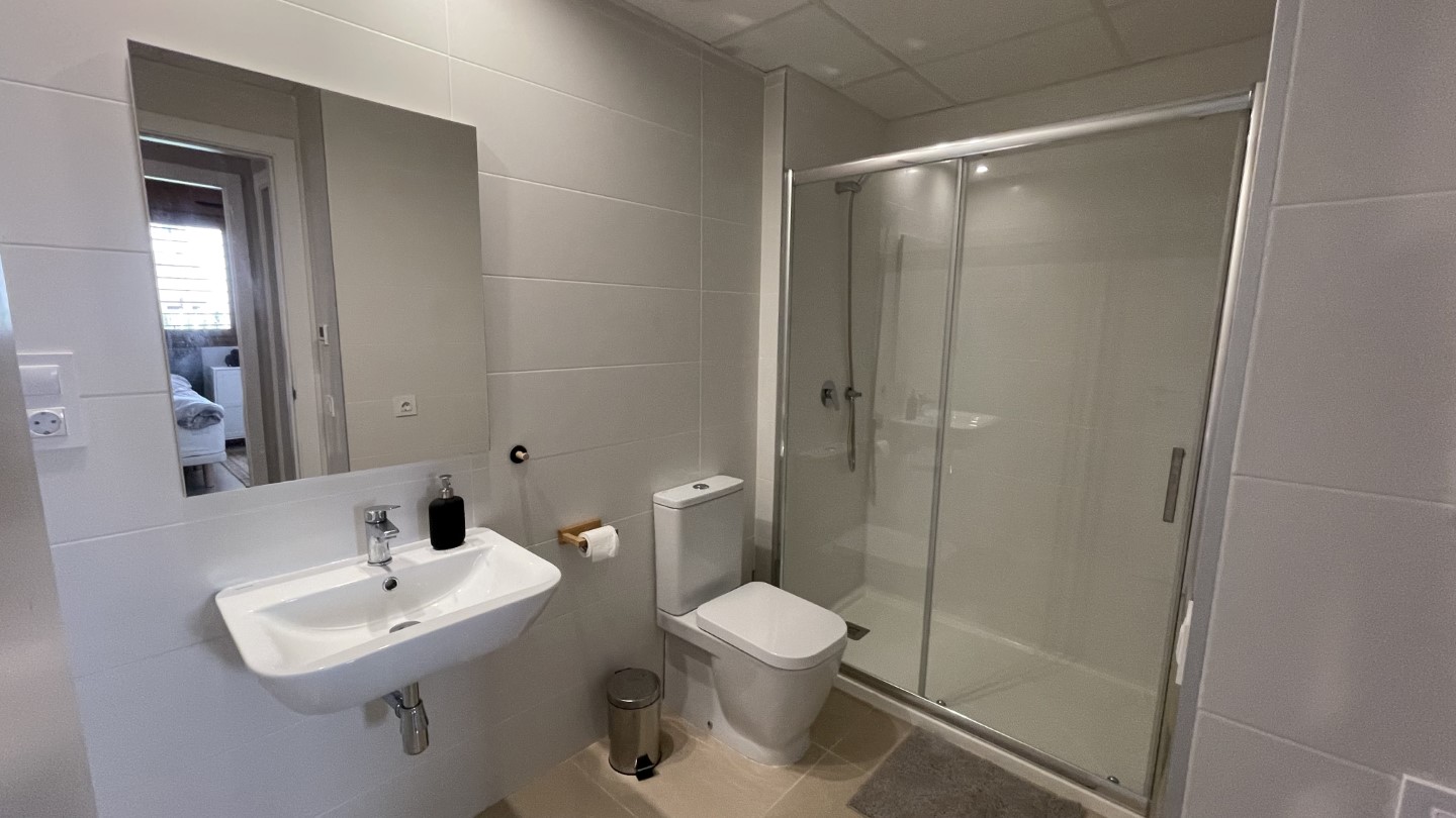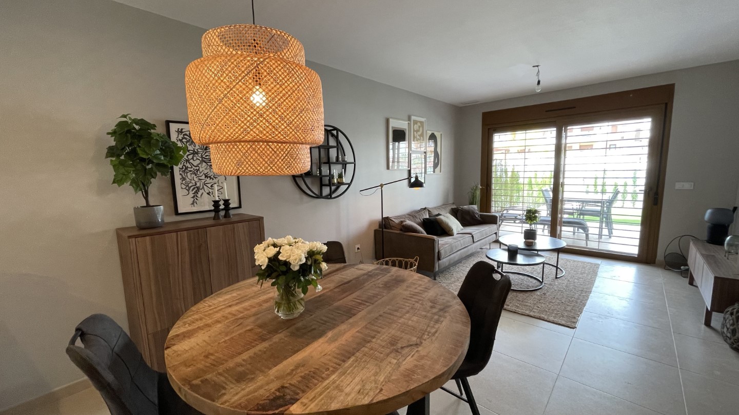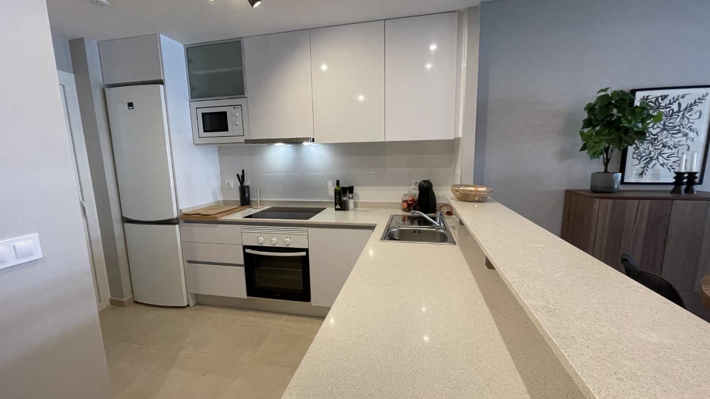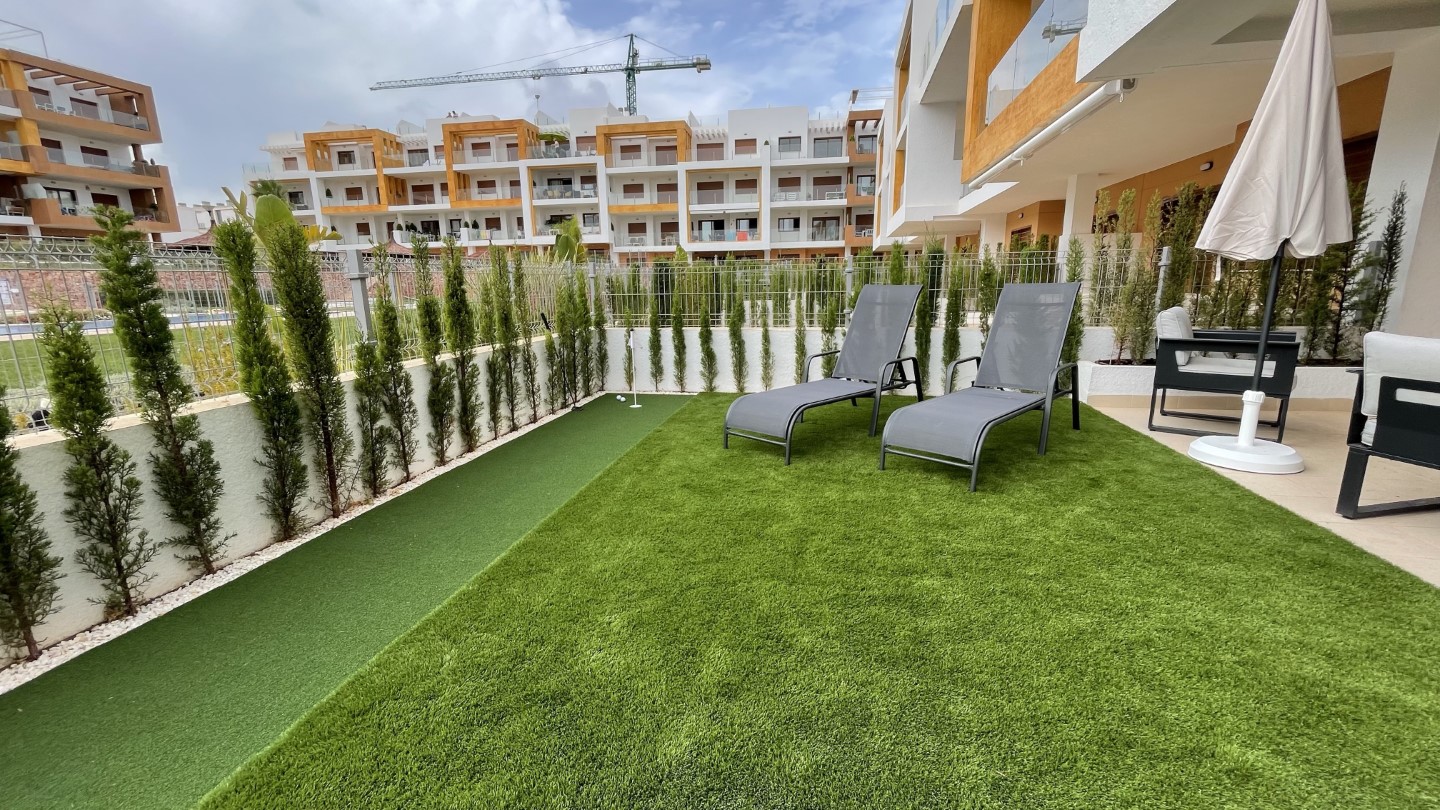 Glæsileg og vel útbúin íbúð á jarðhæð, íbúðin skiptist í forstofu, eldhús, stofu, þvottahús, tvö svefnherbergi og tvö baðherbergi. Íbúðin er mjög vel staðsett, nálægt golfvöllum, La Zenia Boulevard mallinu, veitingastöðum, La Zenia ströndinni og allri helstu þjónustu. Nútímaleg íbúð umkringd stórri sundlaug, tveimur nuddpottum og barnasundlaug. Fallegur garður sem er tilvalinn til að sleikja sólina. Eigninni fylgir sér bílastæði í lokuðum bílakjarna. Frá stofu er gengið út á flísalagða verönd með góðum útihúsgögnum og WEBER rafmagnsgrilli, í framhaldi er gervigras með golfholu þar sem tilvalið er að æfa púttinn fyrir komandi golfhring à þeim glæsilegu golfvöllum sem eru í boði à svæðinu. Íbúðin er með flísum á gólfum, gólfhita á baðherbergjum. Í þessari eign er vatnsfilter sem þýðir að þú getur drukkið vatnið beint úr krananum. Í stofunni er Smart TV með íslenskum stöðvum og enska boltanum.