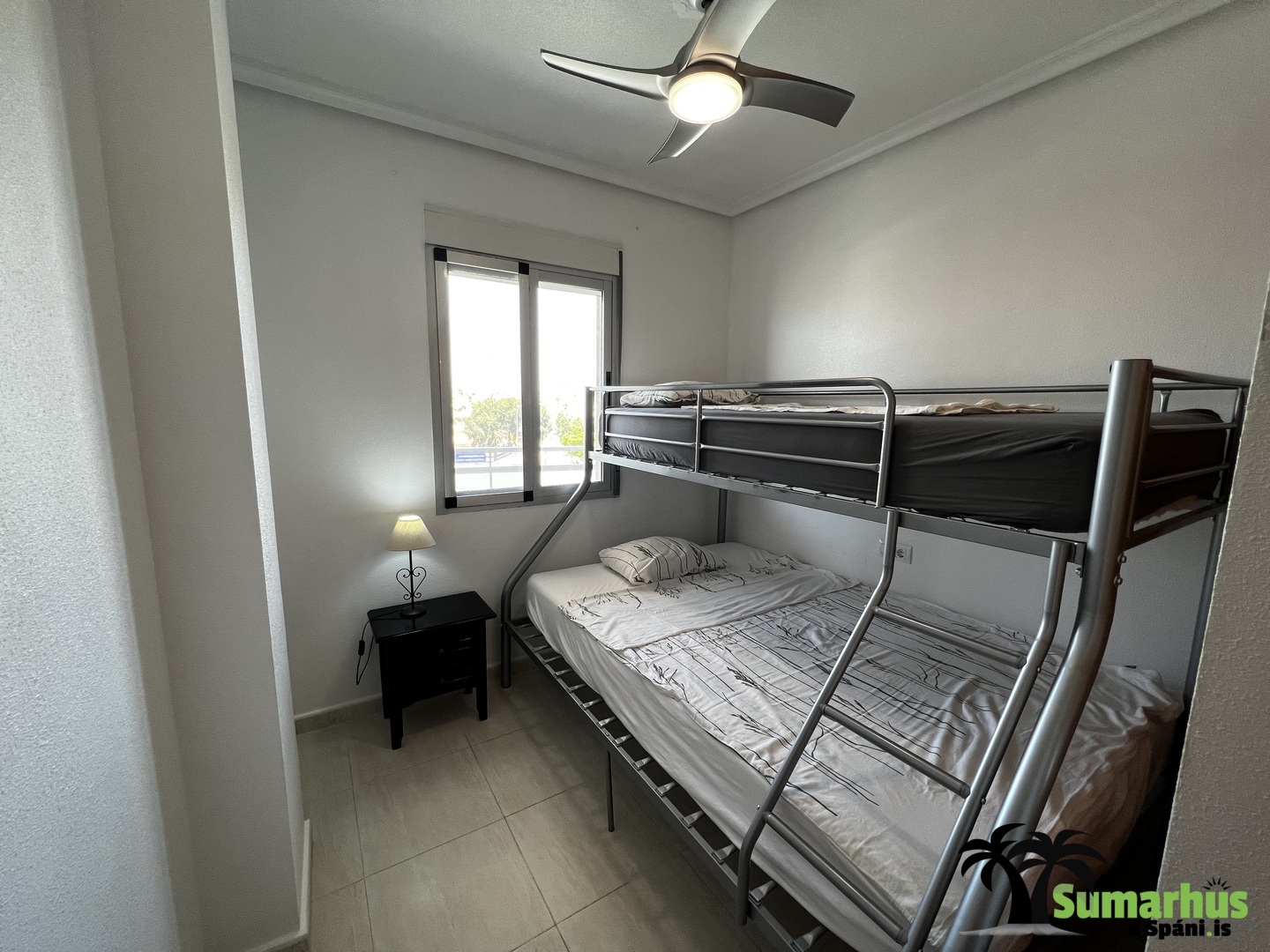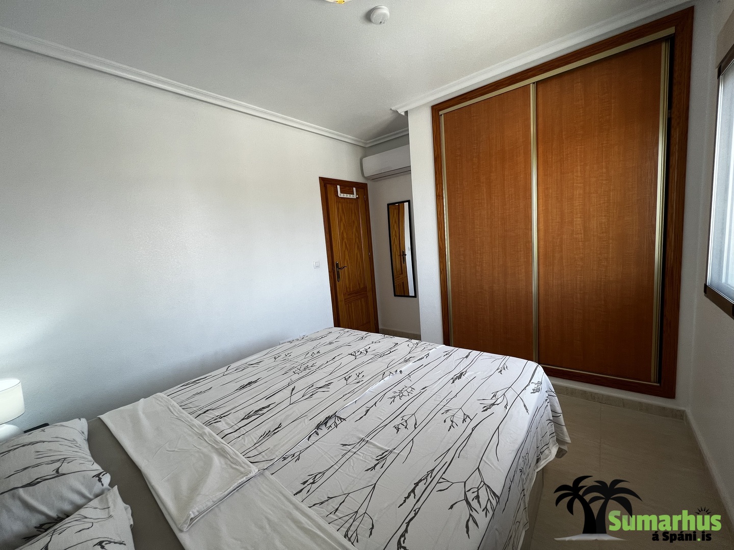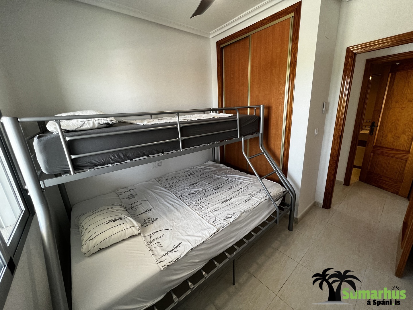 Sængur eru í íbúðinni sem gott er að nota á vorin og yfir vetrartímann. Einnig er barnaferðarúm ásamt matarstól.