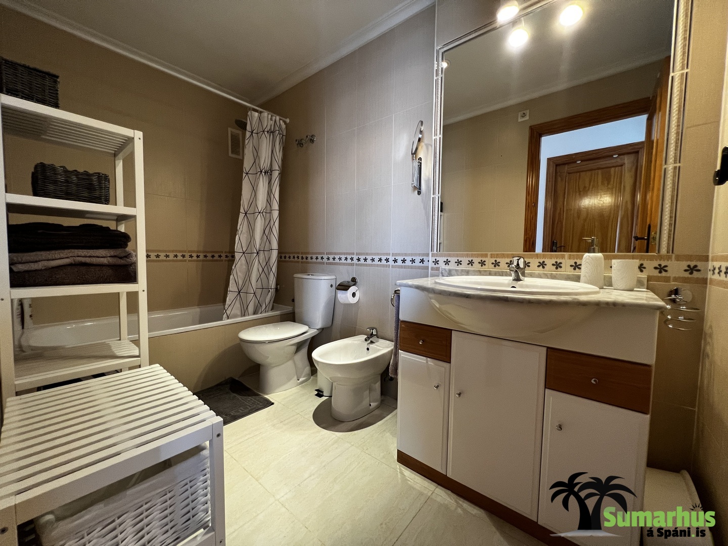Hitt baðherbergið er með baðkari með sturtuaðstöðu, salerni, vaski og innrétting með skúffum.