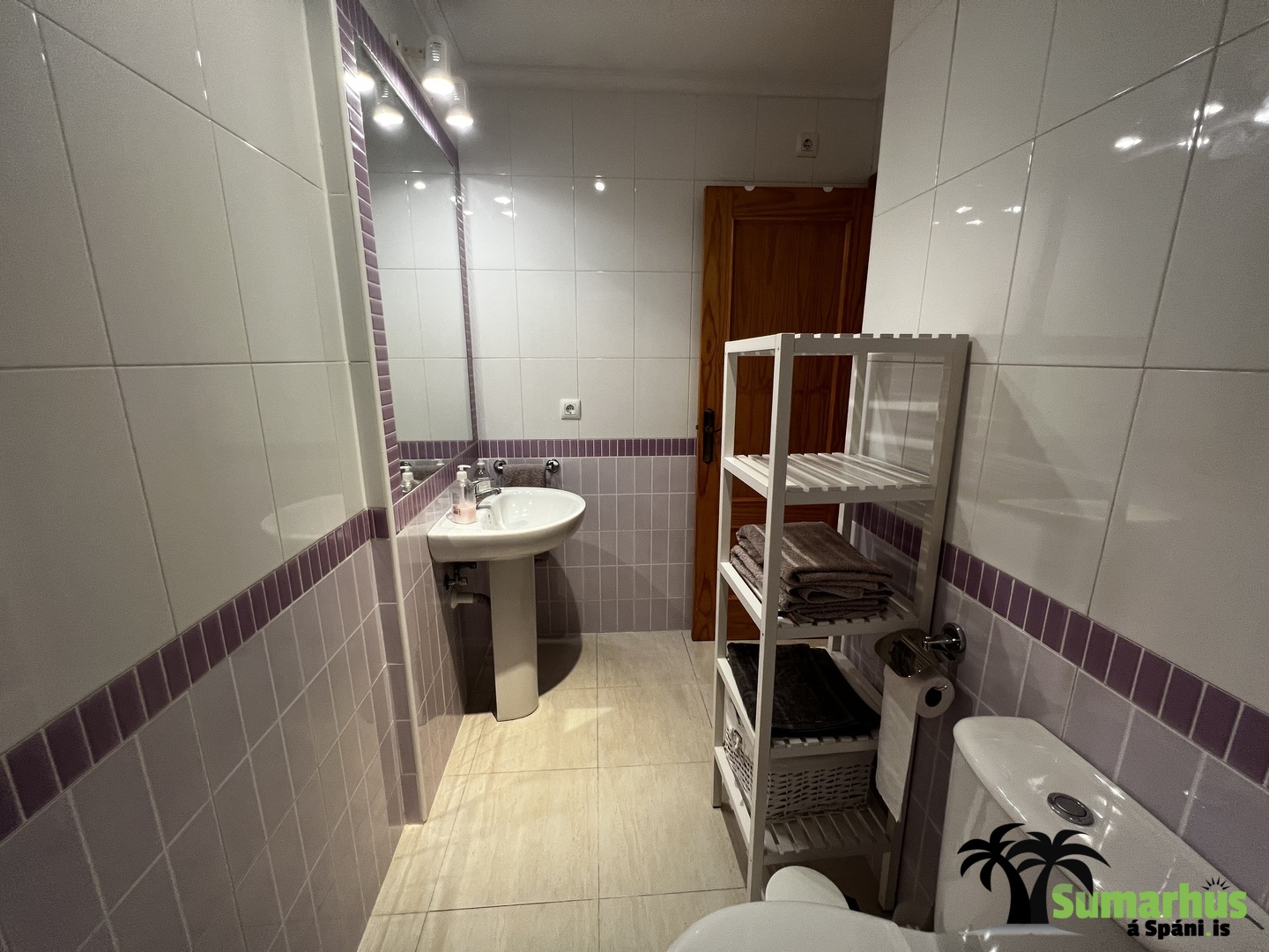 Baðherbergi með salerni, vaski, góðri sturtu og hillum.