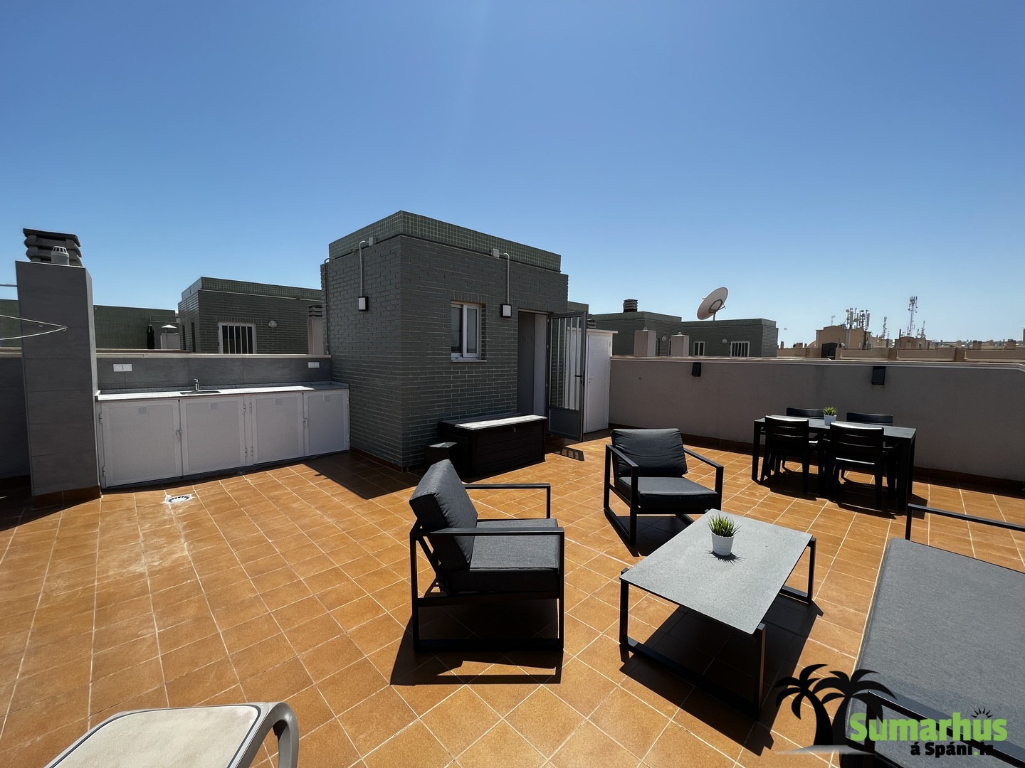 Innangengt er úr íbúðinni upp á einka þakverönd, þar eru góðir sólbekkir, stólar, borð, sófasett og gasgrill. Uppi á þaki er eldhúseining með auka ísskáp, þvottavél, vask og útisturtu. Í hótelgarðinum er sundlaug sem er til afnota fyrir gesti og góð sólbaðsaðstaða. Á neðstu hæð hússins er frábært kaffihús, Le Paradis, veitingastaðir og ýmis önnur þjónusta.