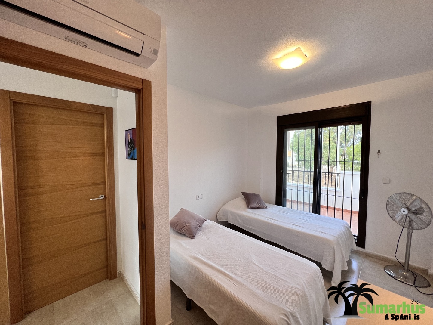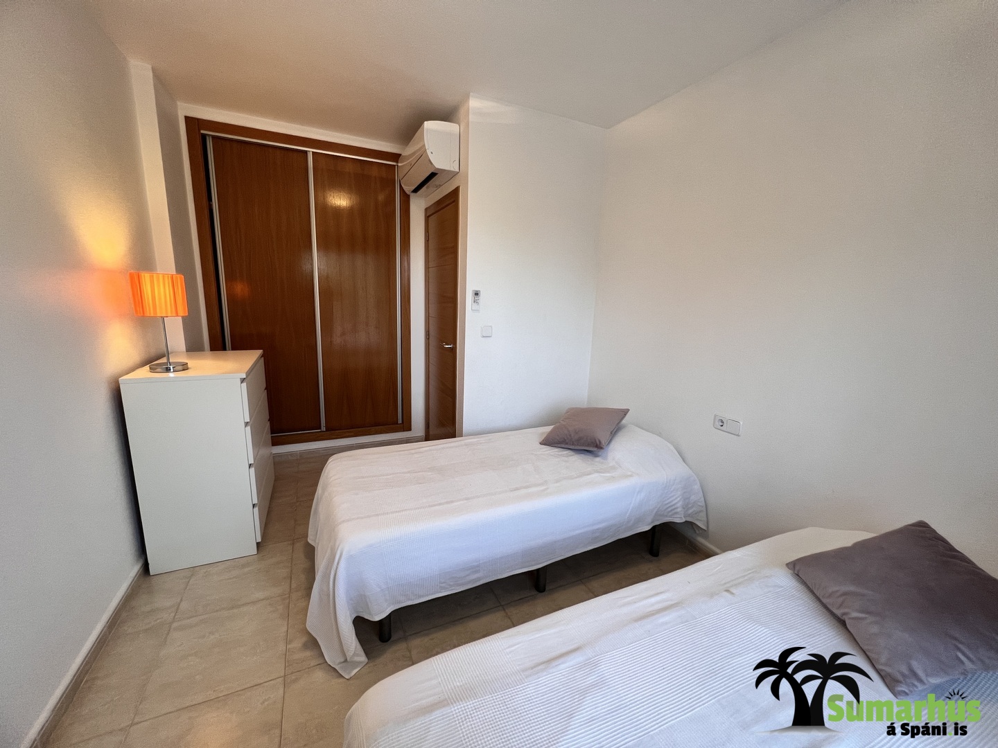 Svefnherbergi 2: Er á annari hæð með tveimur einstaklingsrúmum sem má einnig setja saman sem hjónarúm, fataskápum og loftkælingu.