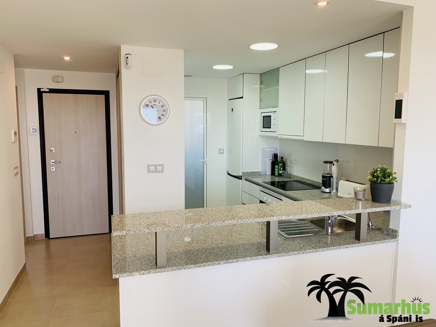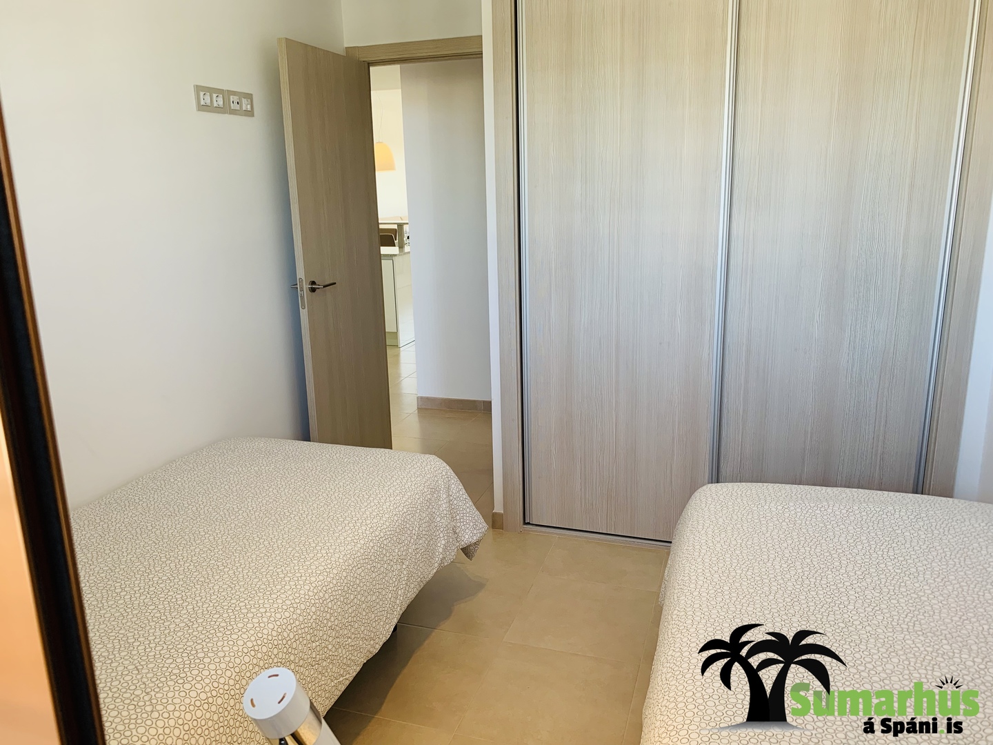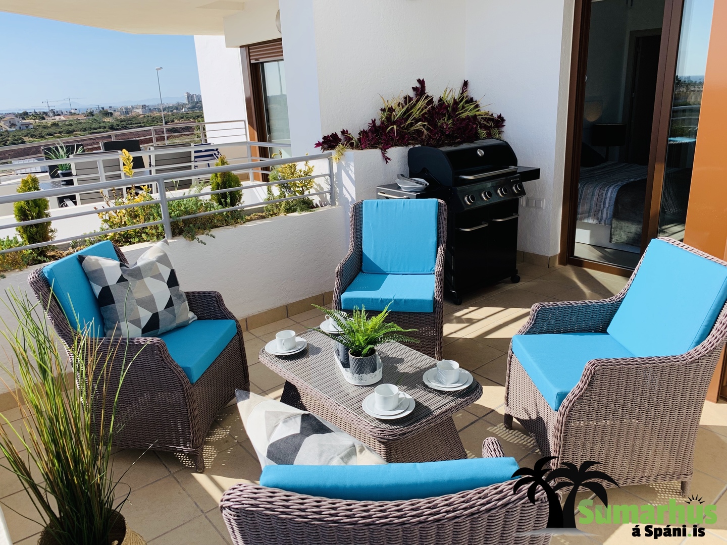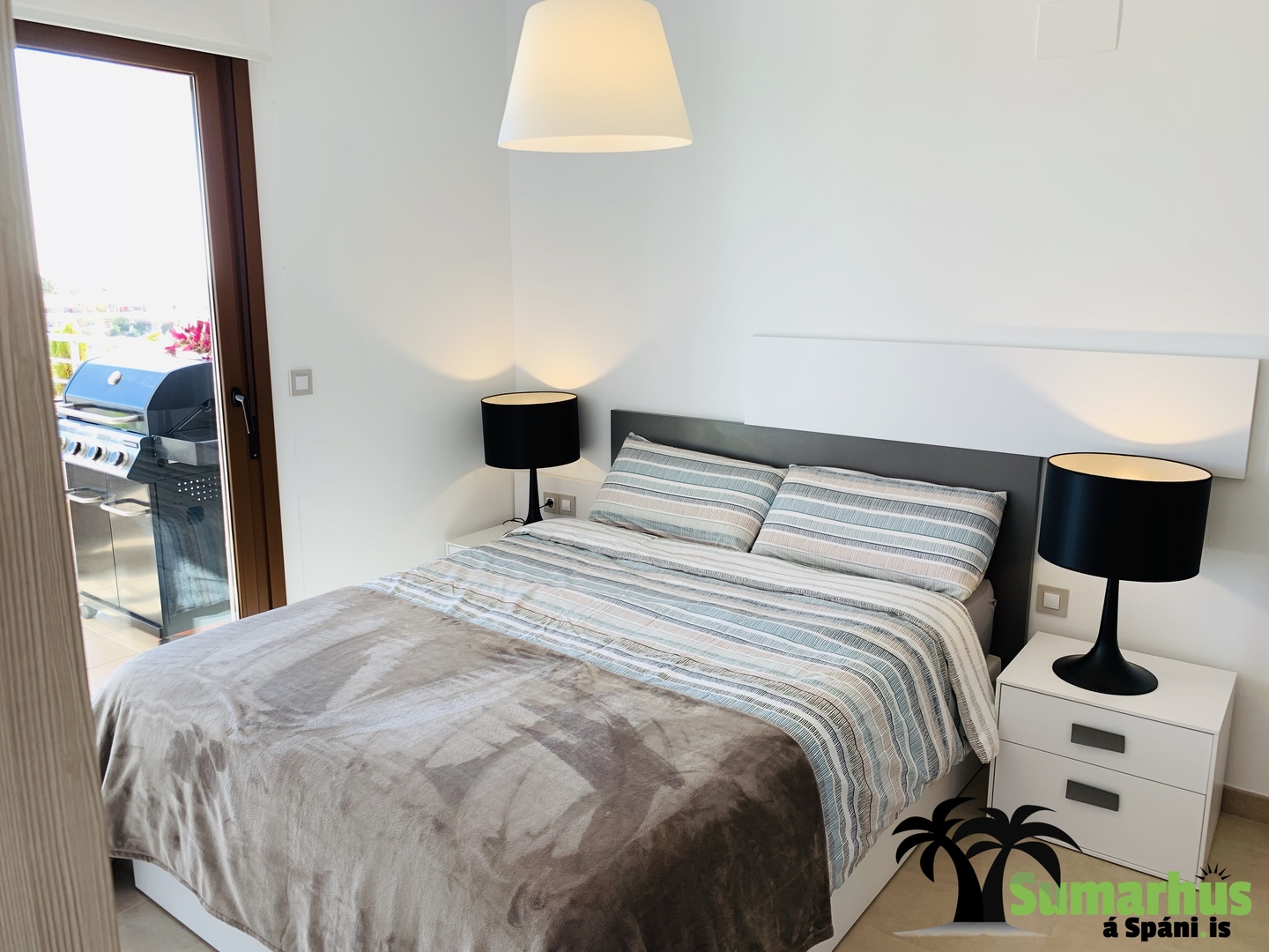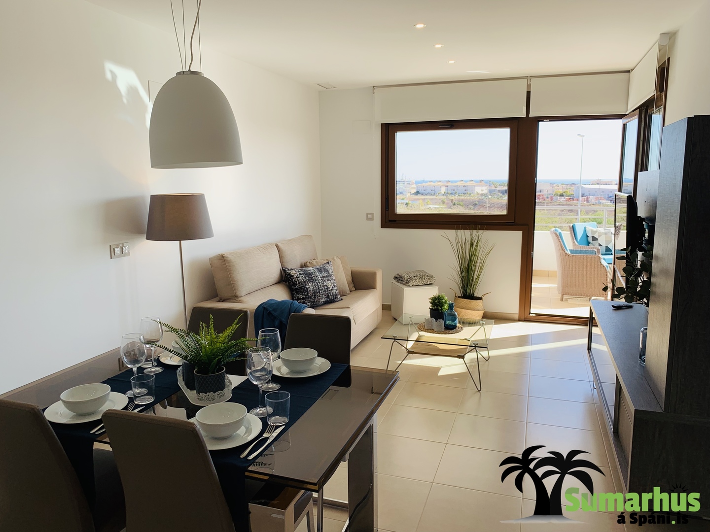 Íbúðin er á annari hæð með góðum svölum í glænýjum íbúðarkjarna í Lomas de Cabo Roig hverfinu og er mjög vel búin. 3 fallegir garðar eru inná milli húsana með sundlaugum, heitum potti, leiksvæði fyrir börnin, líkamsræktartækjum og hafa gestir aðgang að þeim öllum. Hverfið er mjög rólegt og gott, veitingastaðir eru í göngufæri og stutt að skreppa á ströndina, á fimmtudagsmarkaðinn, í La Zenia mallið og niður á göngugötuna í Cabo Roig. Einnig eru margir golfvellir stutt frá hverfinu eins og Campoamor, Villamartin, Las Colinas og Las Ramblas. Íbúðinni fylgir stæði í bílageymslu.