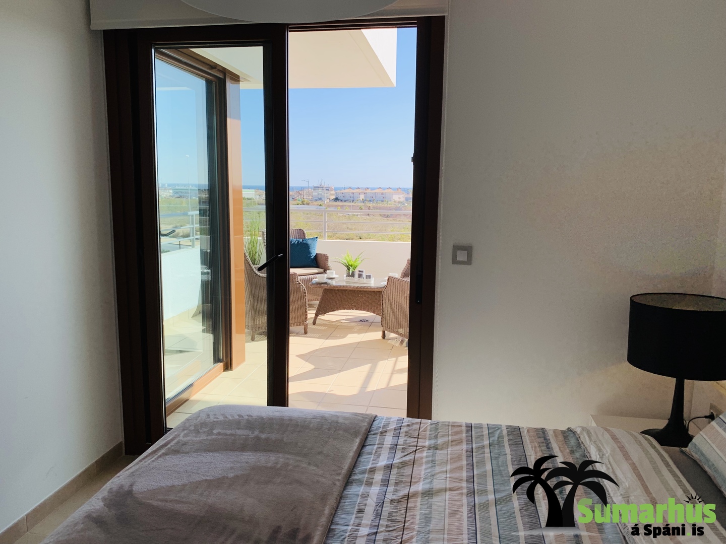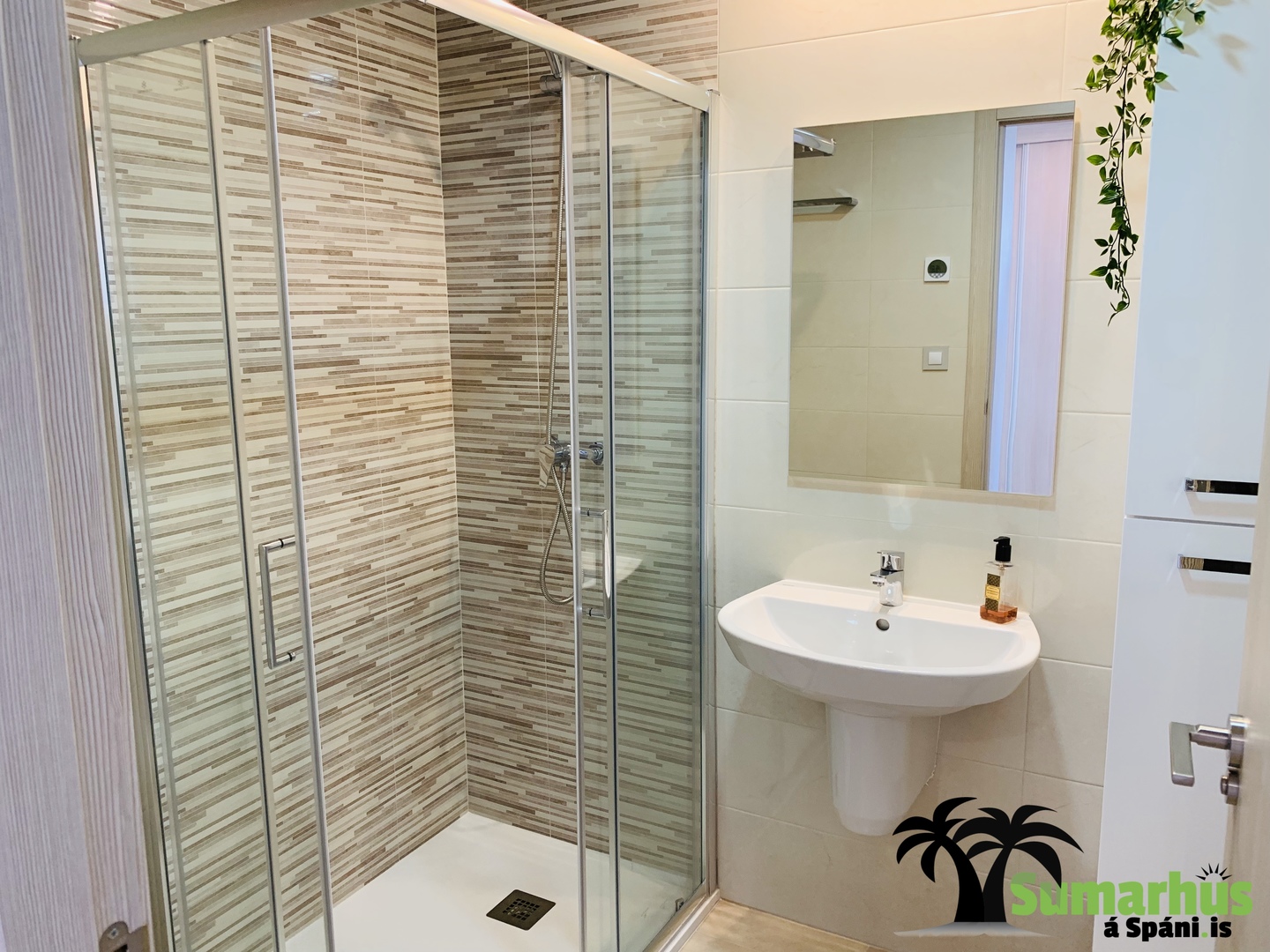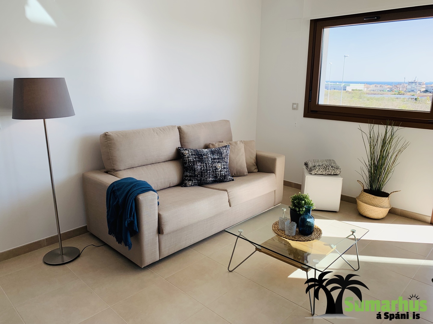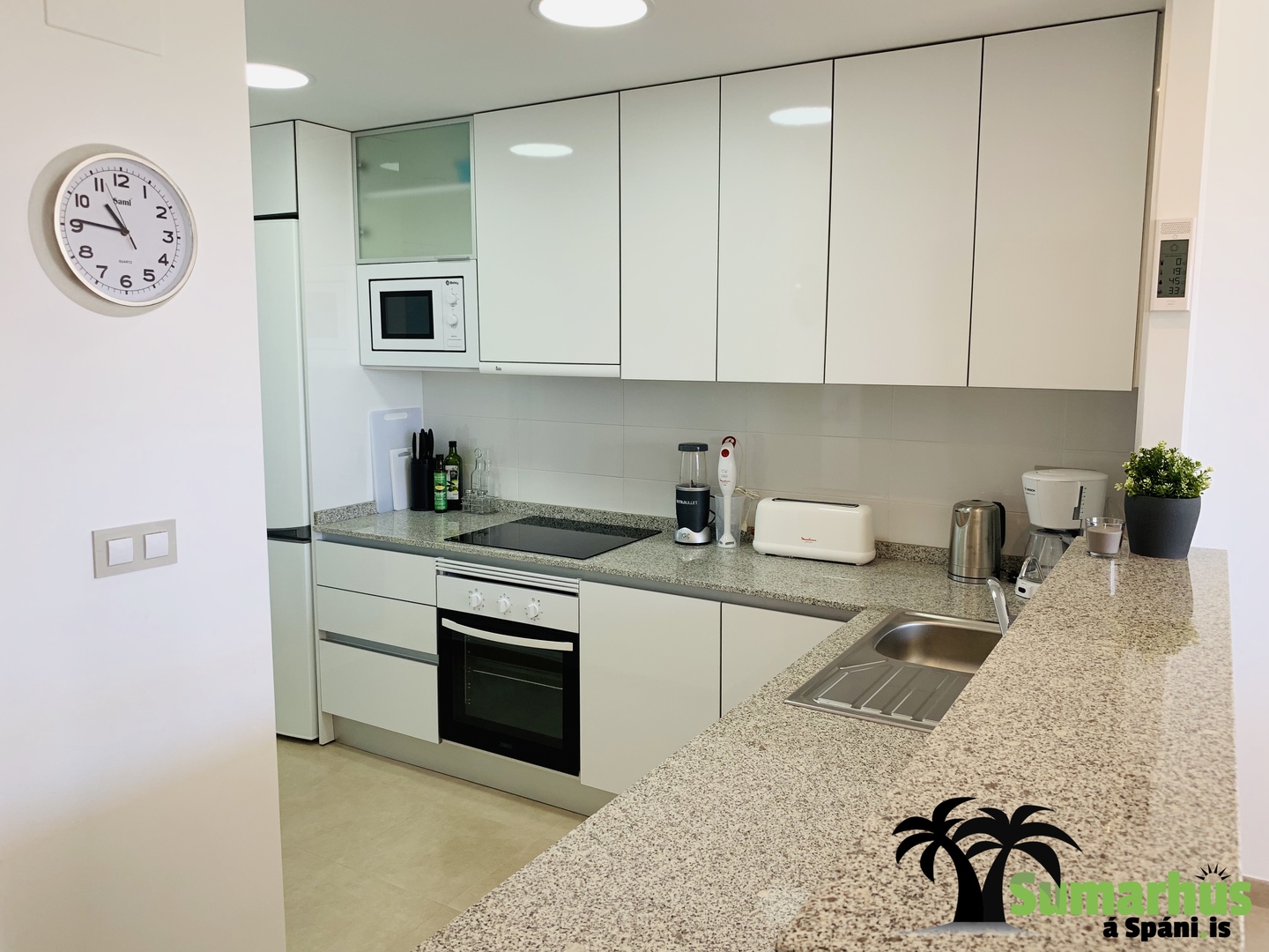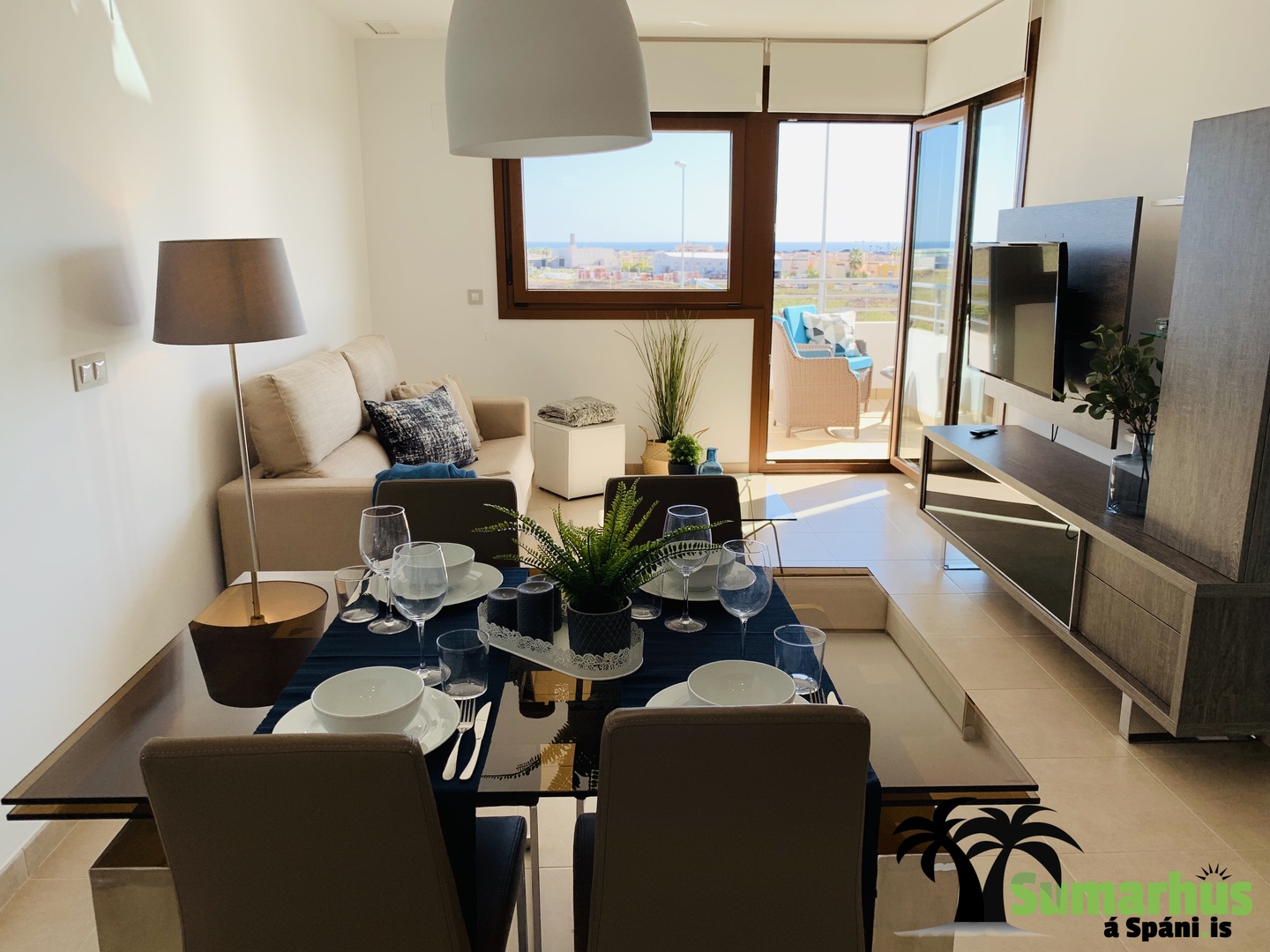 Íbúðin er á annari hæð með góðum svölum í glænýjum íbúðarkjarna í Lomas de Cabo Roig hverfinu og er mjög vel búin. 3 fallegir garðar eru inná milli húsana með sundlaugum, heitum potti, leiksvæði fyrir börnin, líkamsræktartækjum og hafa gestir aðgang að þeim öllum. Hverfið er mjög rólegt og gott, veitingastaðir eru í göngufæri og stutt að skreppa á ströndina, á fimmtudagsmarkaðinn, í La Zenia mallið og niður á göngugötuna í Cabo Roig. Einnig eru margir golfvellir stutt frá hverfinu eins og Campoamor, Villamartin, Las Colinas og Las Ramblas. Íbúðinni fylgir stæði í bílageymslu.