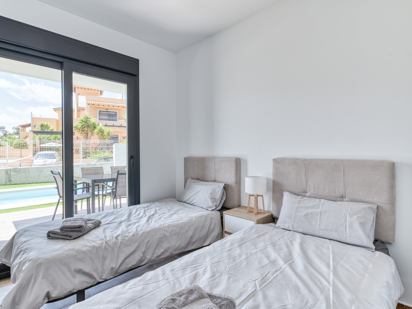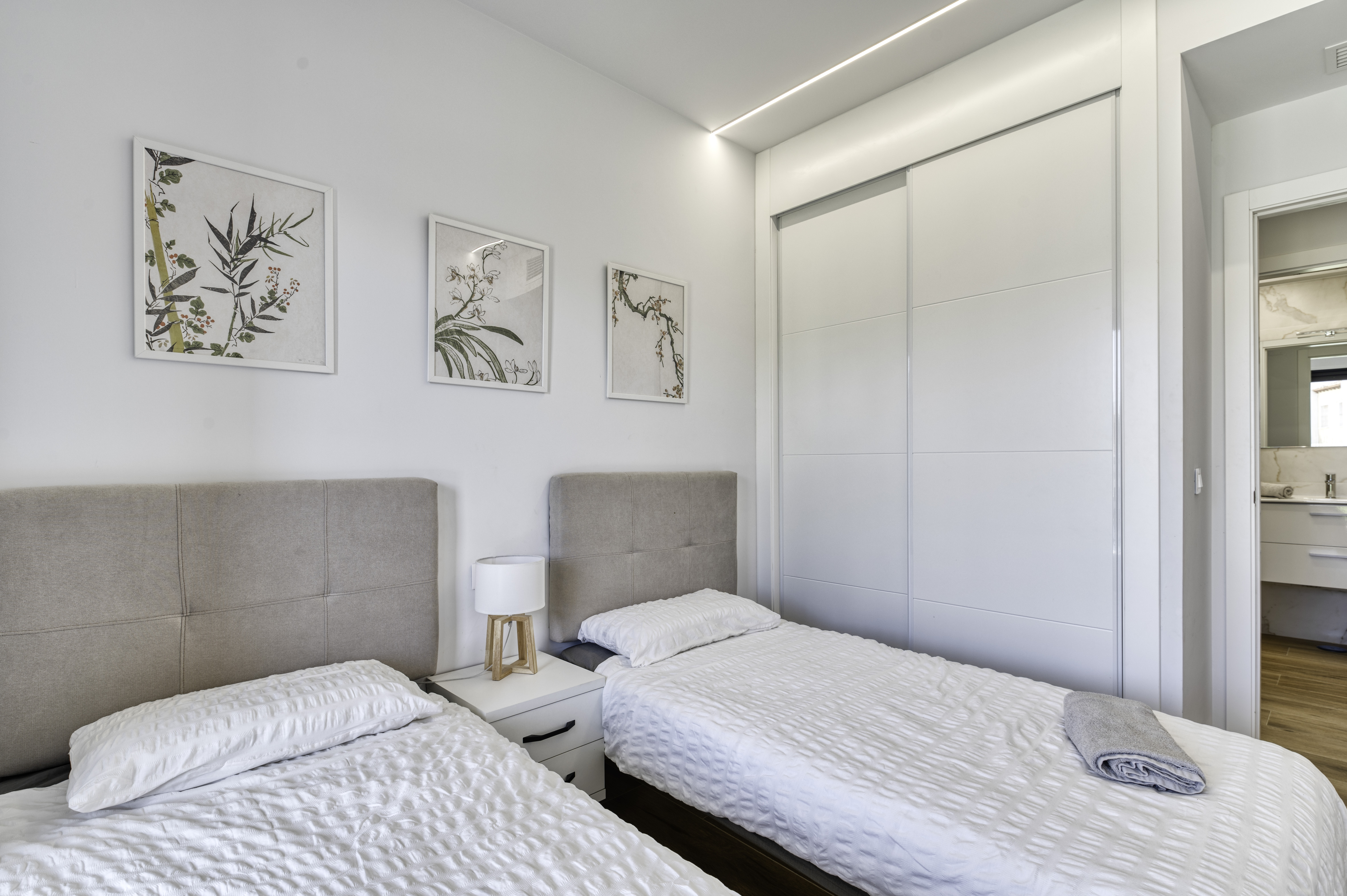 Hjónherbergið er með 150 x 190 hjónarúmi og góðum fataskápum, innaf hjónaherberginu er rúmgott baðherbergi með sturtu og hægt að ganga beint út í garðinn.  Gestaherbergið er með tveimur  90 x 190 einstaklingsrúmum og góðum fataskápum.  Bæði svefnherbergin eru með loftkælingu, sængur eru í íbúðinni sem gott er að nota á vorin og haustin.