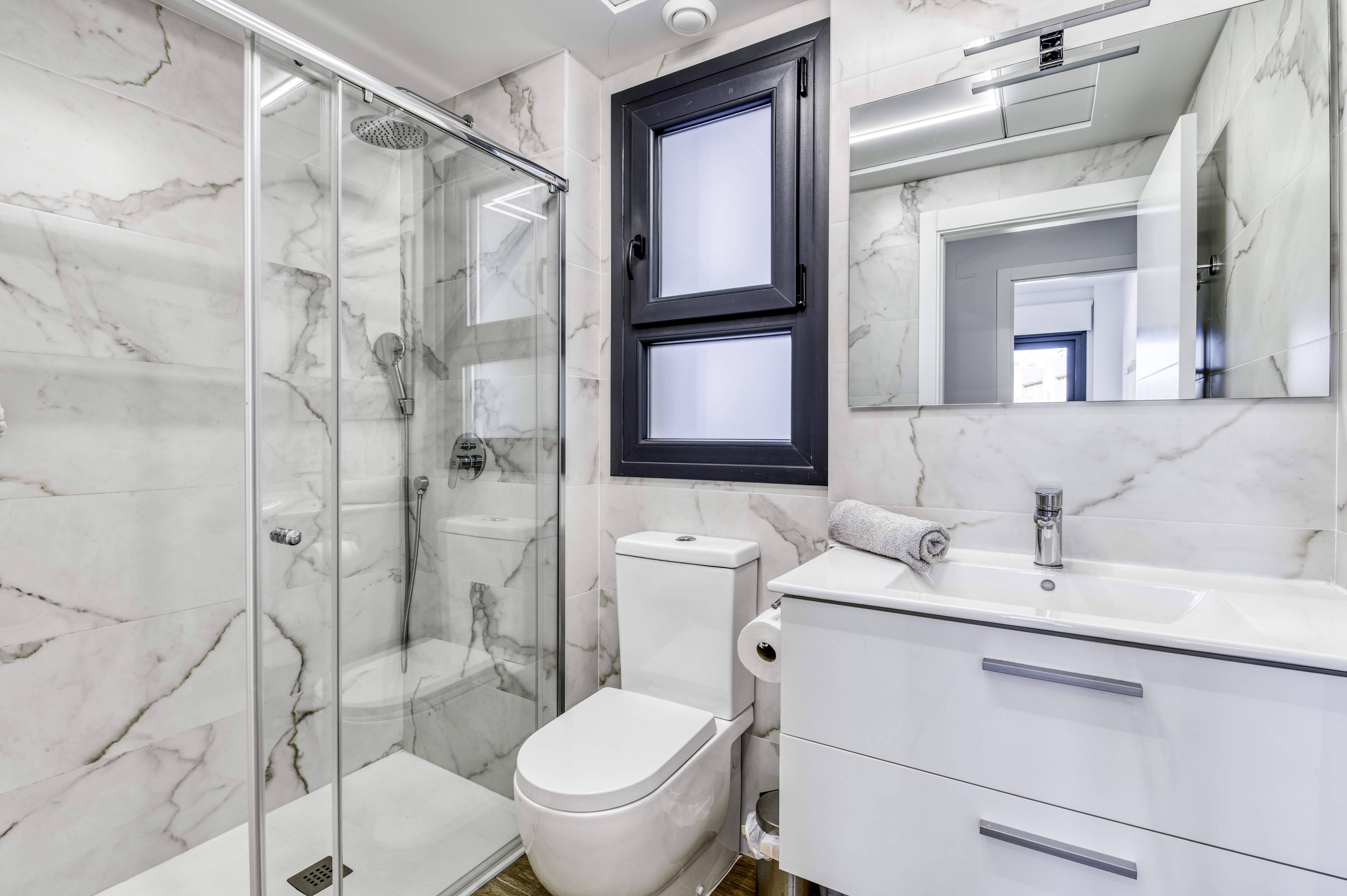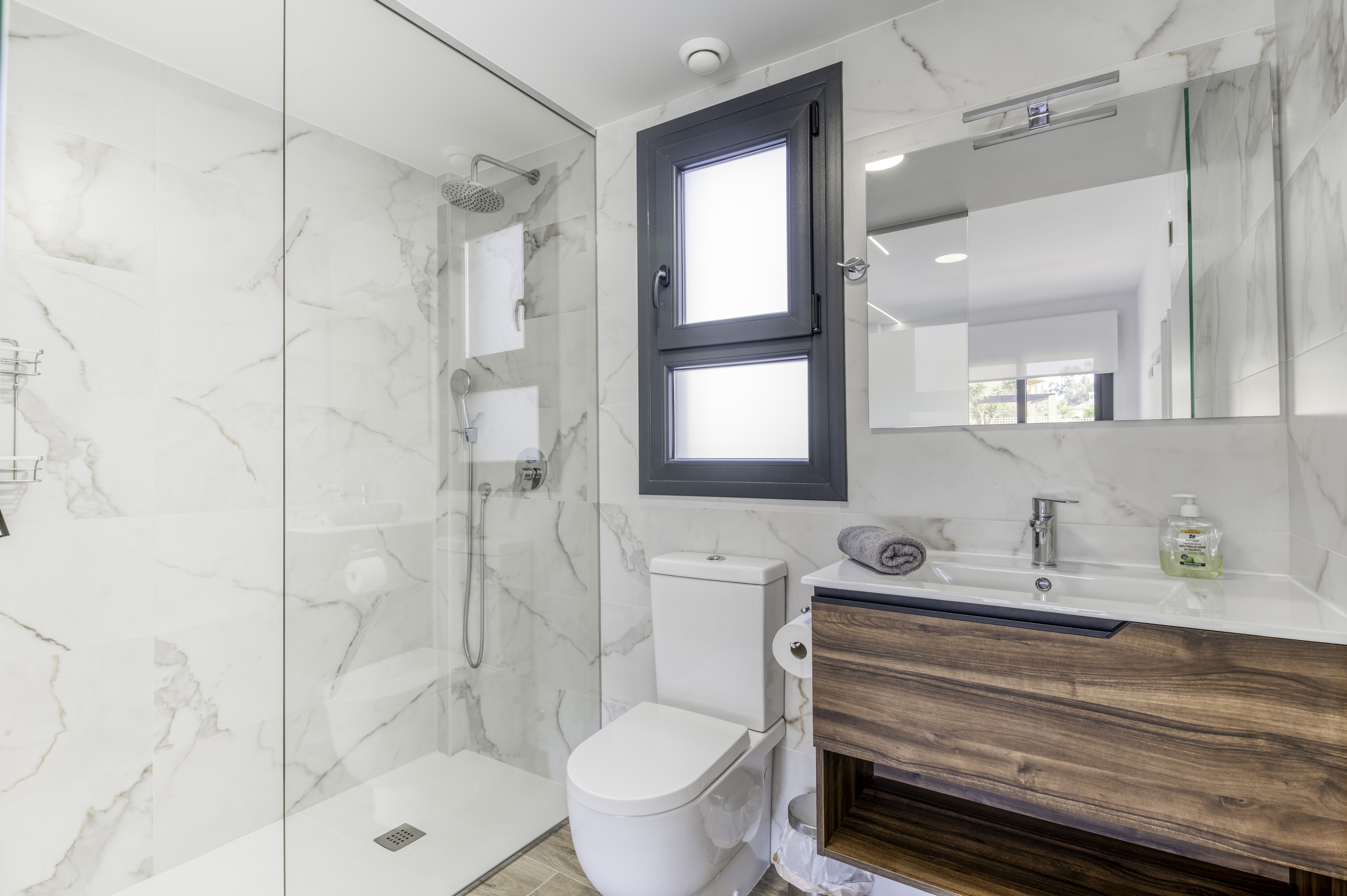Tvö falleg baðherbergi eru í íbúðinni, annað er innaf hjónaherbergi. Þau eru bæði rúmgóð með salerni, vaski, sturtu og innréttingu.  Baðhandklæði fylgja leigu fyrir gesti.